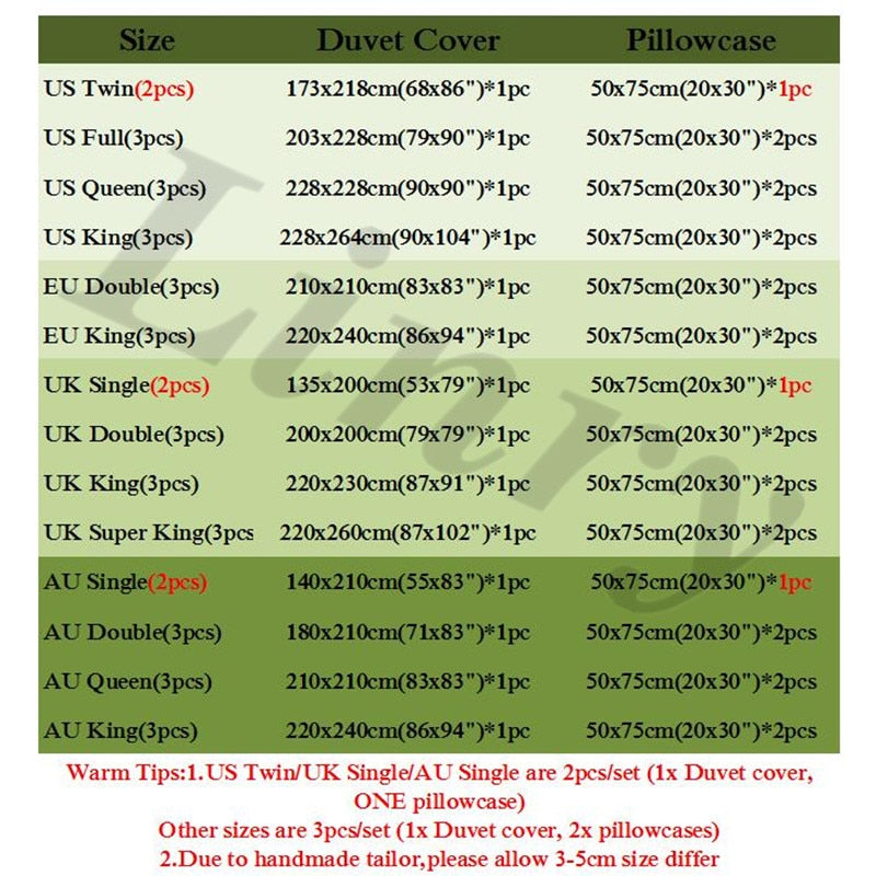 Quantity: Japanese 1 Duvet Cover and 2 Pillowcases (US Twin/UK Single/AU Single are 1 Duvet Cover and 1 Pillowcase)